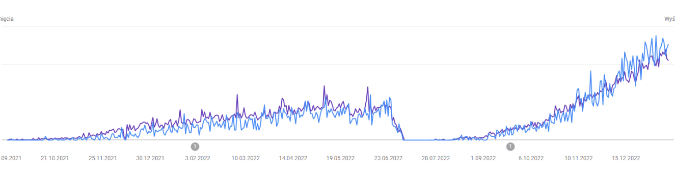 W całej migracji został popełniony jeden błąd, który na długo utkwił mi w pamięci, bo idealnie obrazuje jak dużo jest do stracenia w trakcie takiej operacji. Poniżej zrzut ekranu z Google Search Console z sekcji blogowej w j. greckim. Okazało się, że nowy moduł blogowy inaczej transliterował URLe artykułów blogowych z alfabetu greckiego na łaciński (co ciekawe, nie było tego problemu z cyrylicą), a nie zostało to wychwycone. Blog grecki dopiero raczkował i stanowił promil całego ruchu, więc straty były stosunkowo niewielkie. Ruch udało się odbudować po 6 miesiącach, a finalnie udało się go wielokrotnie przeskalować.